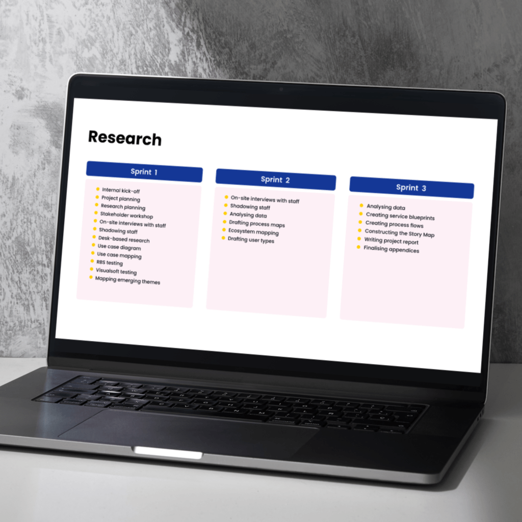 Visualising and mapping current processes and systems using process flows, service blueprints, and an ecosystem map, to identify pain points and areas for improvement.