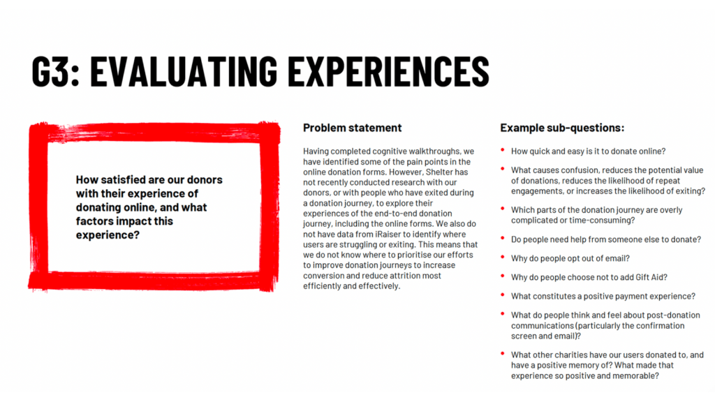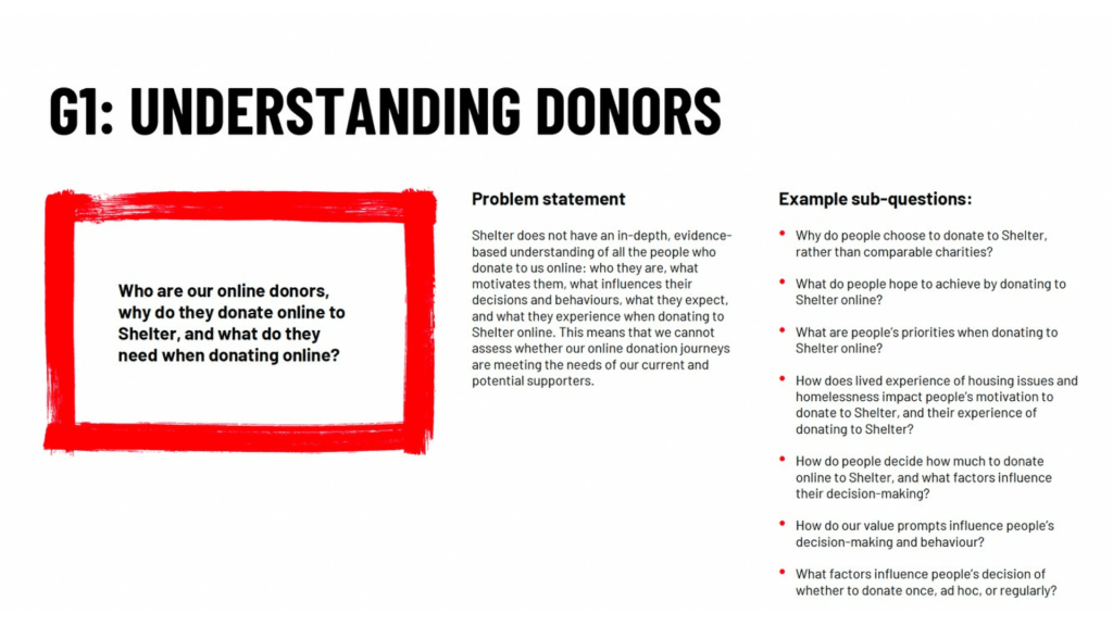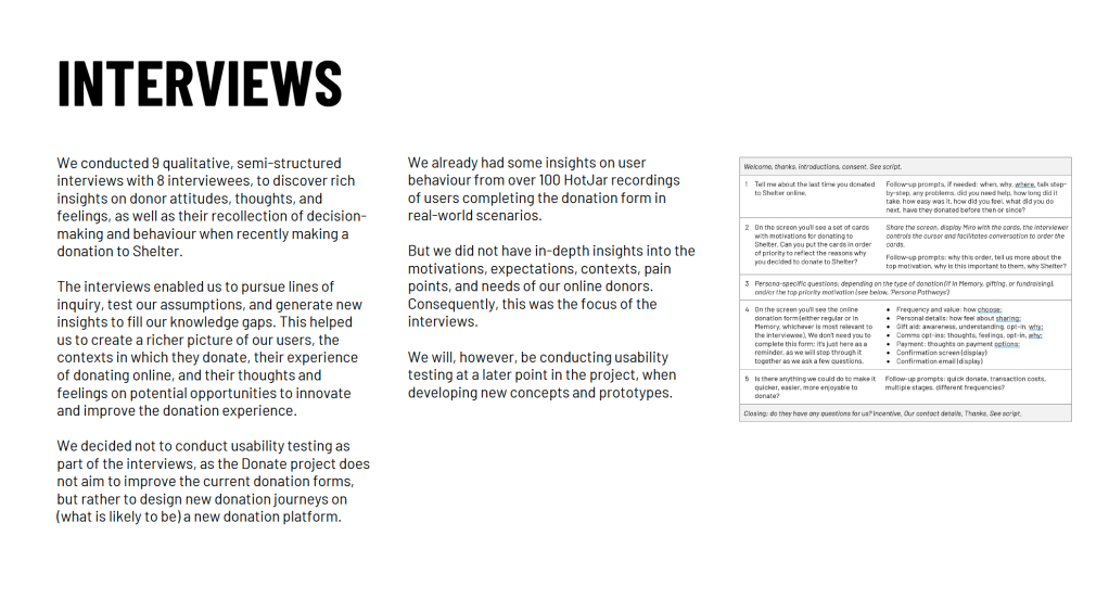 But the in-depth, semi-structured interviews were extremely helpful for painting a richer picture of Shelter’s donors, the contexts in which they donate, their experience of donating online, and their thoughts and feelings on potential opportunities to innovate and improve the donation experience.