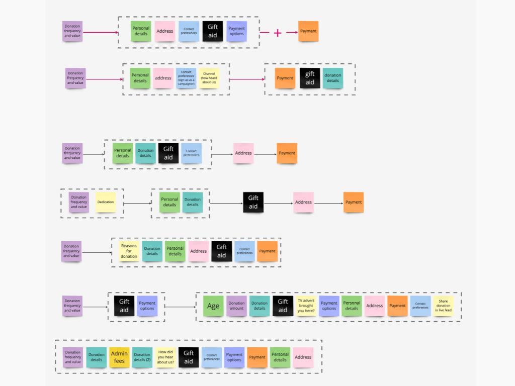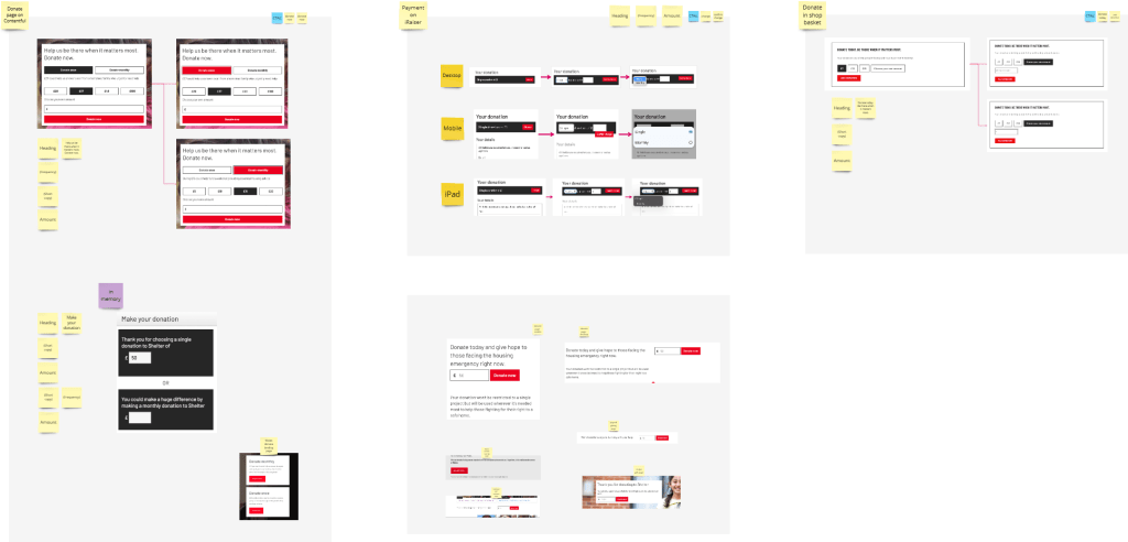 I started by carrying out desk-based research to map Shelter’s donation landscape, identifying different donation journeys and scenarios, and the connections between them.