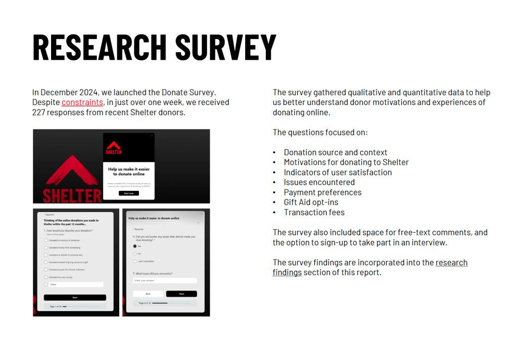 I designed and launched an online survey for people who had recently donated to Shelter. The survey was designed to be both a research tool and a recruitment tool for inviting specific individuals to interview.