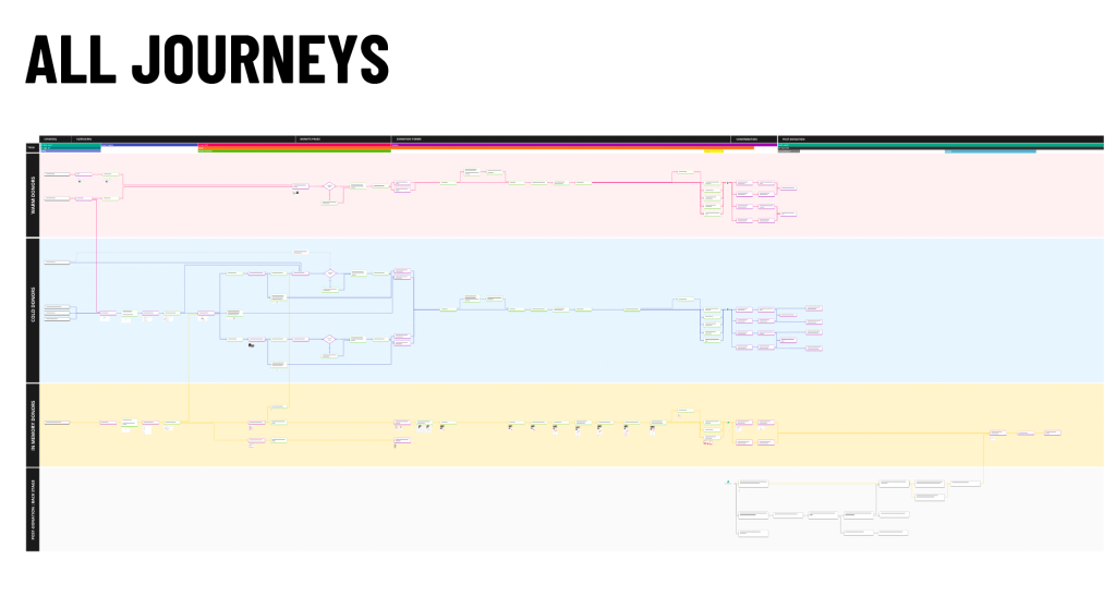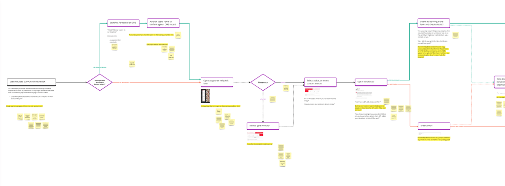 I created various maps, including user journey maps, journey flows, and servce blueprints, to visualise the donation journeys, as well as pain-points and opportunities. The process of creating these artefacts has been as valuable as the products, as it has brought clarity to the complexity of multiple interlinked but different donation journeys.