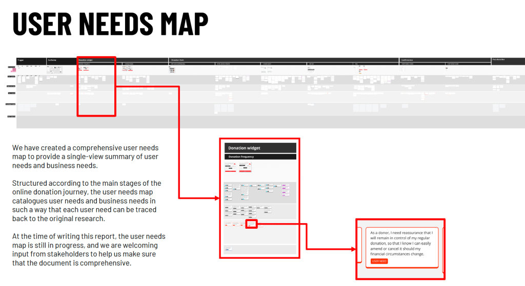 One of the most important design artefacts I created is the user needs map, which provides a single-view summary of user needs and business needs. Structured according to the main stages of the online donation journey, the user needs map catalogues user needs and business needs in such a way that each requirement can be traced back to the original research.