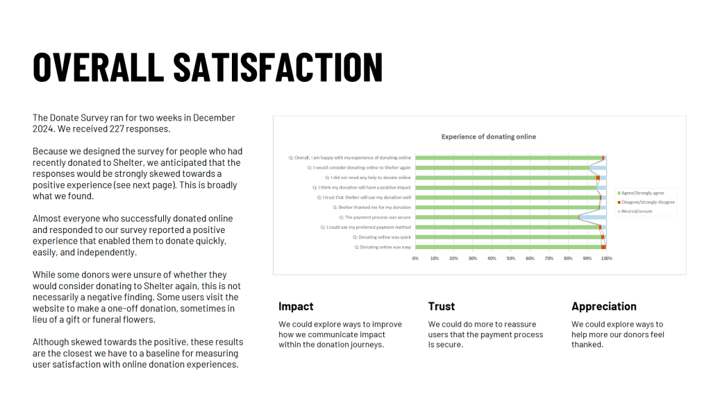 Working collaboratively with colleagues and stakeholders, I quickly formed a comprehensive understanding of online donations at Shelter: how things work, what is going well, what needs to be improved, and how it could be improved.