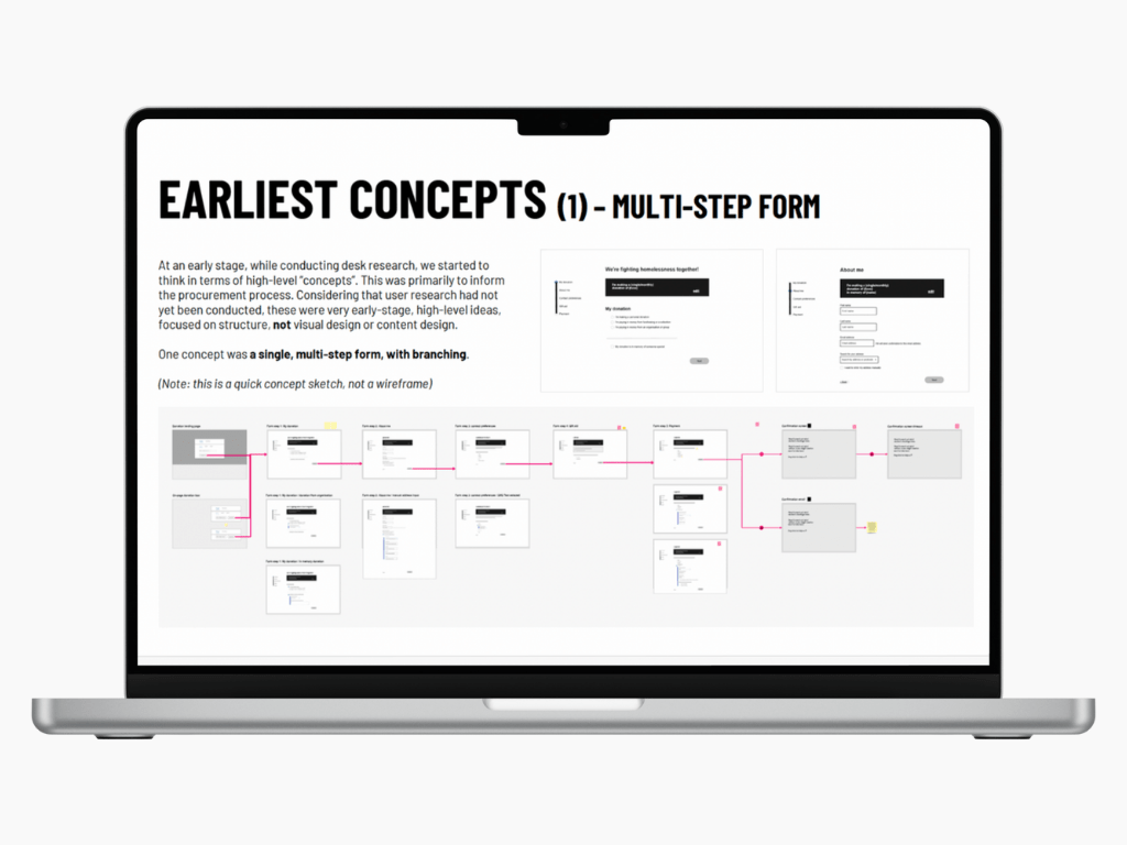 I created a knowledge-base of actionable insights by producing and presenting a comprehensive (100+ page) written report, covering a breadth of topics, including: information architecture; visual design; content design; external compliance; trust and security; anonymity and personal data; ethical and responsible design; inclusive design and trauma-informed design.
