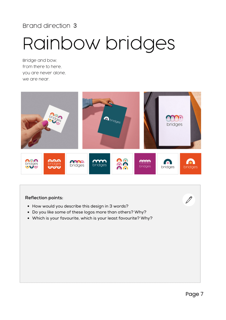 I wanted to consult all staff at the charity, so I created and shared a workshop pack with the brand designs, and prompts for people to reflect on independently.